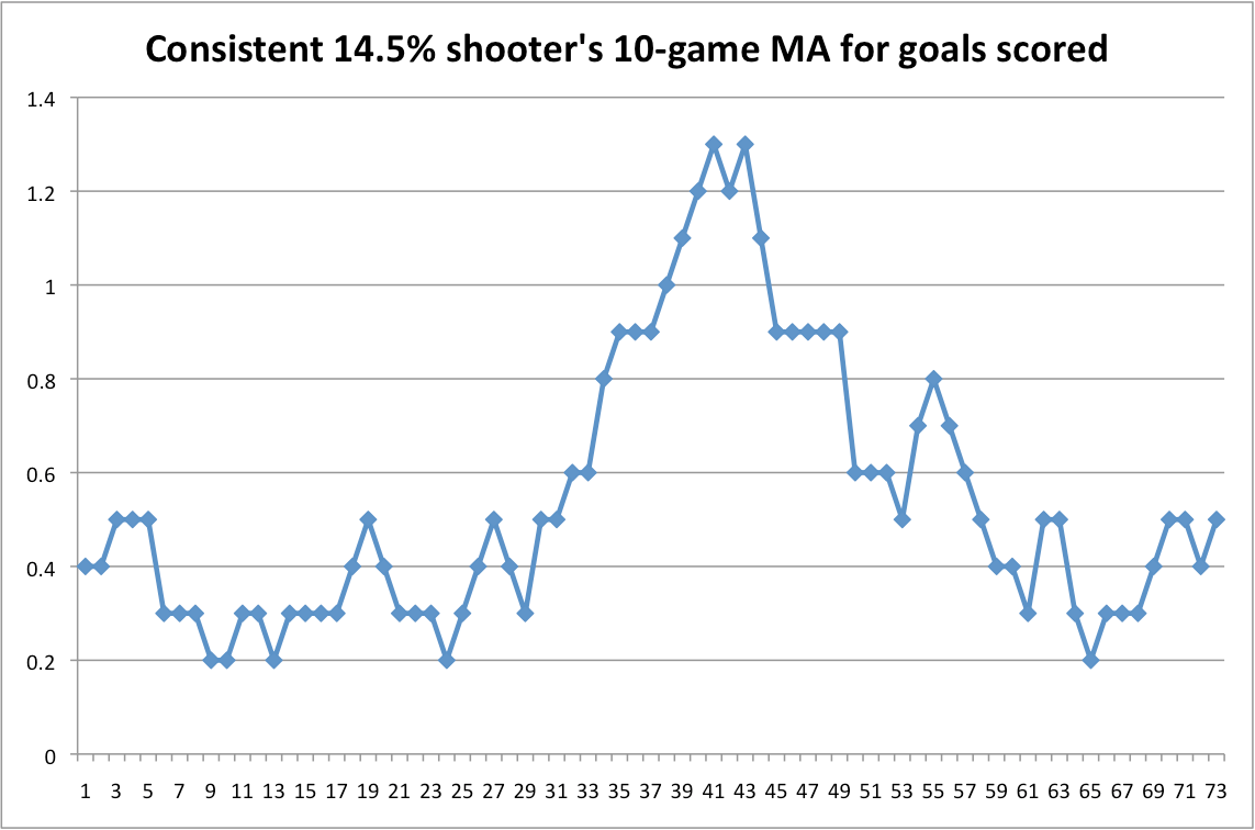 This chart is a random simulation of a hypothetical 35-goal scorer, who averages 3 shots a game and shoots 14.5% night in and night out– Mr. Super Consistency– using a 10-game moving average to smooth out the curves. Look at how streaky he appears, yet his shooting percentage (14.5%) and shots per game (3) never deviated on any given night.