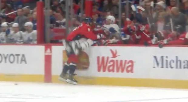 Alex Ovechkin checked Leafs defenseman Conor Timmins into the Capitals bench